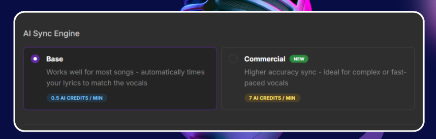 Commercial (Enhanced Engine): Recommended for complex, fast-paced tracks, rap, or layered vocals where superior timing accuracy is needed to avoid manual correction in the Sync Editor. (7 AI Credits/min)