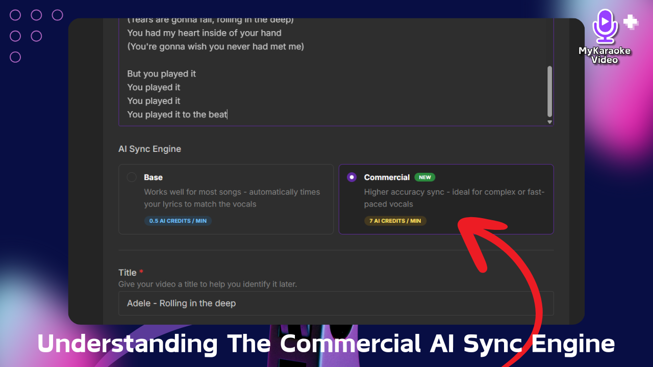 The Commercial AI Sync Engine is an advanced processing option available on the 1-click Karaoke/Lyric Video Generator screen when you start a new project. It offers high accuracy for lyric synchronization and automatic transcription. You can, as always, choose to use the standard Base AI Sync Engine for cost-effective synchronization.